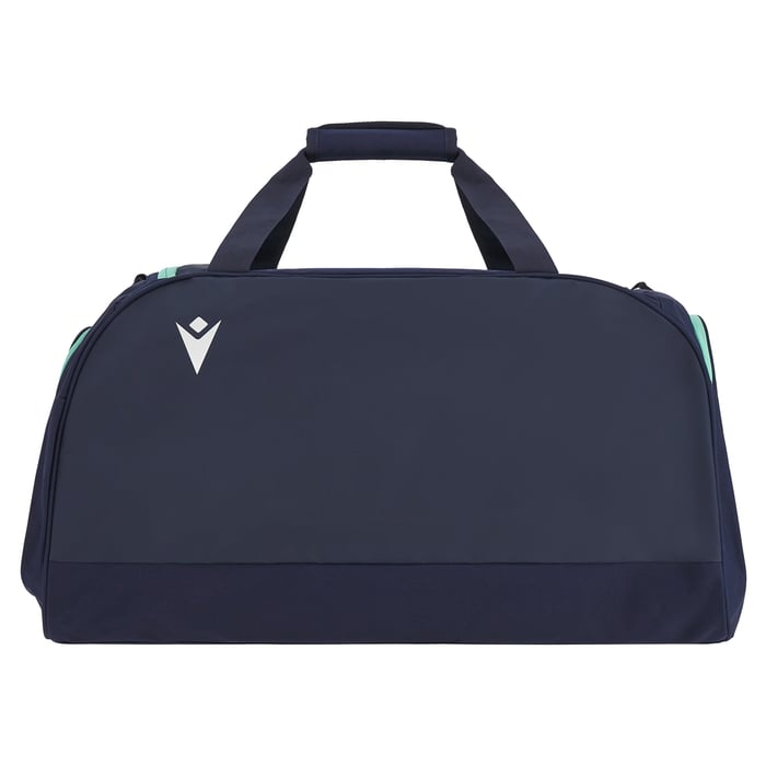 シーグリーンのアクセントと三角パターンのパネルが特徴的なネイビーカラーのジムバッグ。
